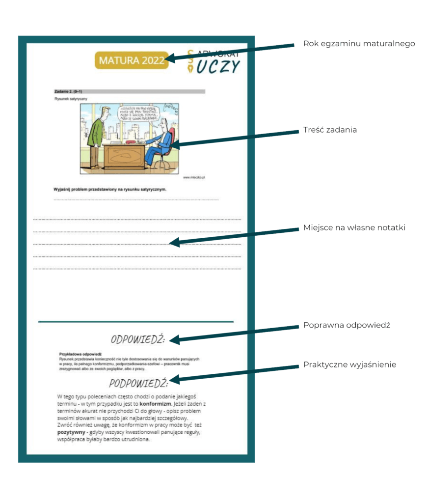 - Kompleksowość: nie potrzebujesz żadnych dodatkowych materiałów (arkuszy maturalnych, podręczników czy repetytoriów), aby w 100% przygotować się do matury.