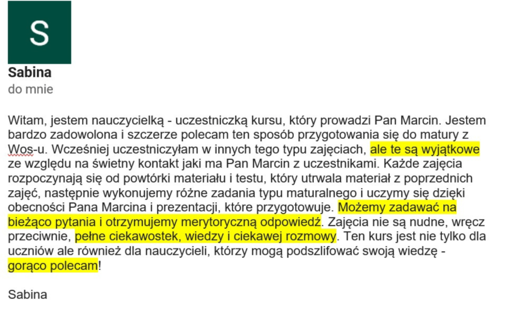 „Kurs bardzo pomógł mi w przygotowaniach do matury i właściwie cała wiedza, jaką posiadam, została zaczerpnięta właśnie z niego.”
